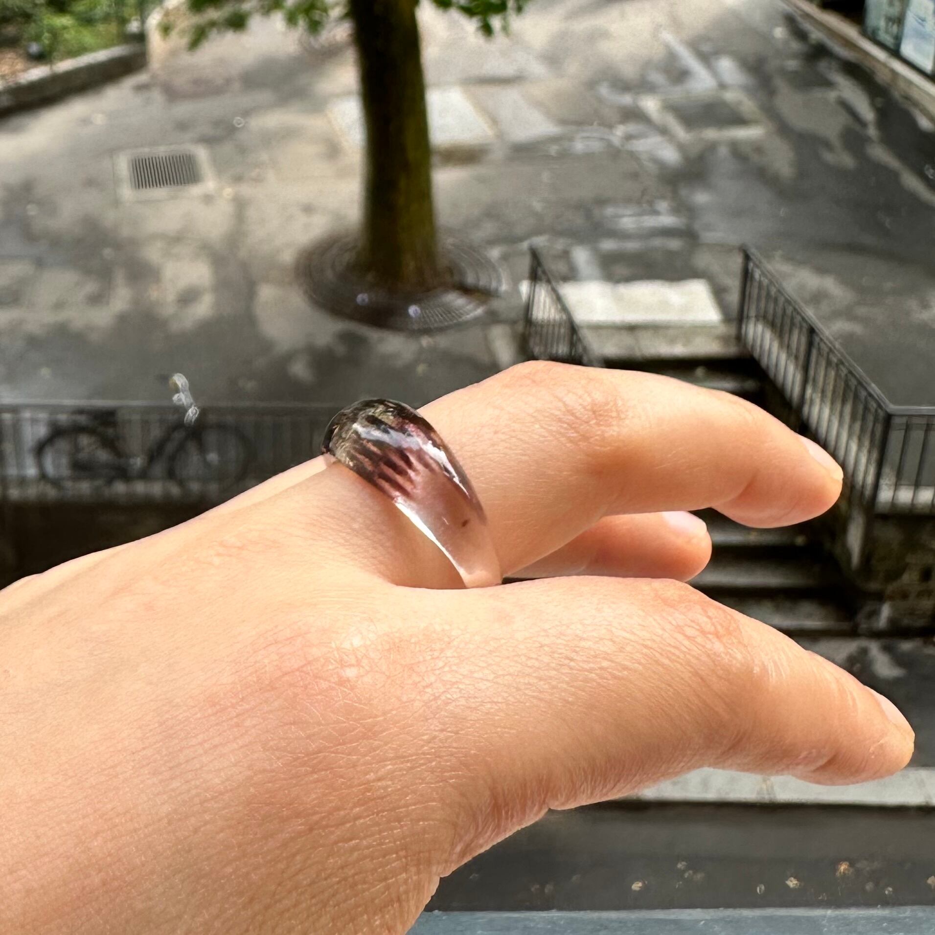 The glass ring has Binbin stripe inside and it changes shades depending on angles. So cute!